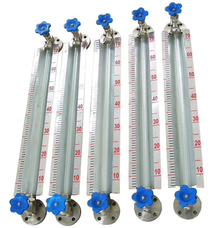 儀表在上下閥上都裝有G3/4"或M27×1.5的螺紋接頭,通過法蘭與容器連接構(gòu)成連通器,透過玻璃管可直接顯示容器內(nèi)液位的高度。